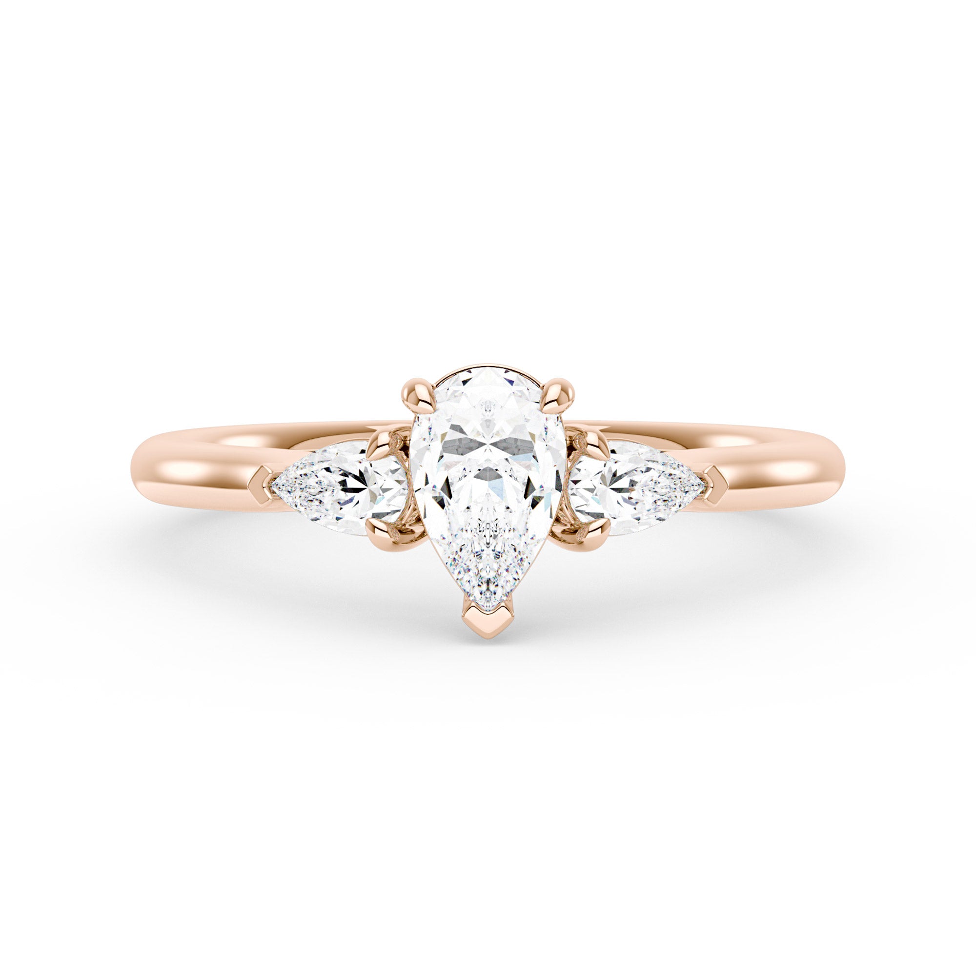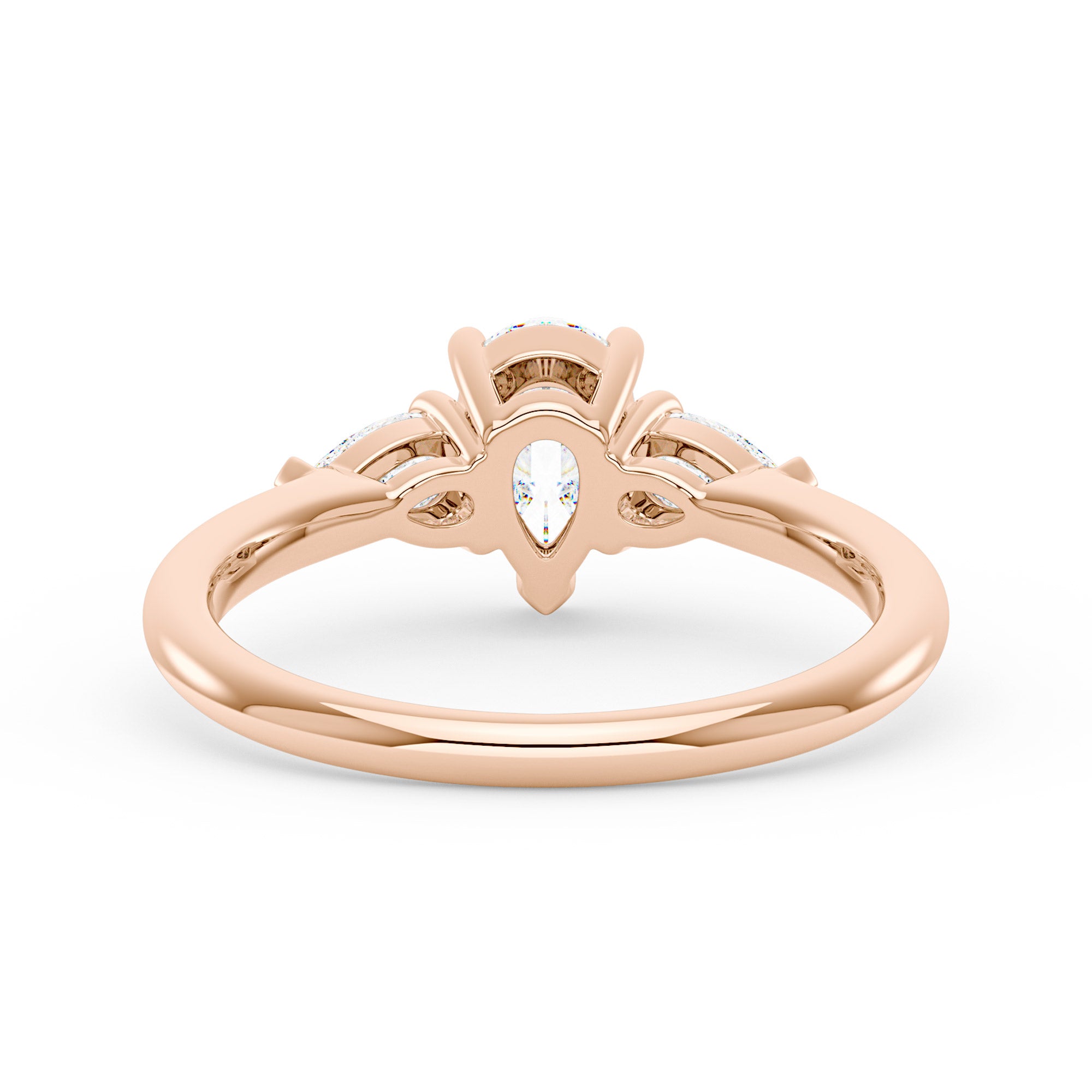 This stunning three stone ring features a 5 mm x 8 mm pear-cut moissanite flanked by two 3 mm x 5 mm pear-cut moissanites, symbolizing the past, present, and future of your love. Set on a sleek solitaire band, this elegant design exudes timeless beauty and brilliance, making it the perfect symbol of lasting commitment.