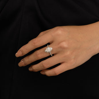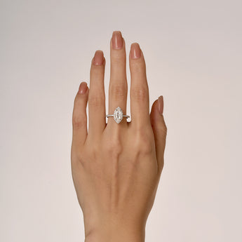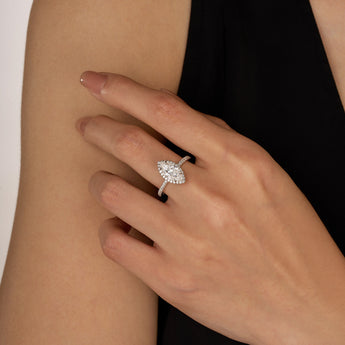 This marquise halo engagement ring features a stunning 2-carat marquise-cut moissanite at the center, surrounded by a halo of round stones for added brilliance. The refined pave band adds a touch of elegance, making it a treasure meant to be cherished forever.
