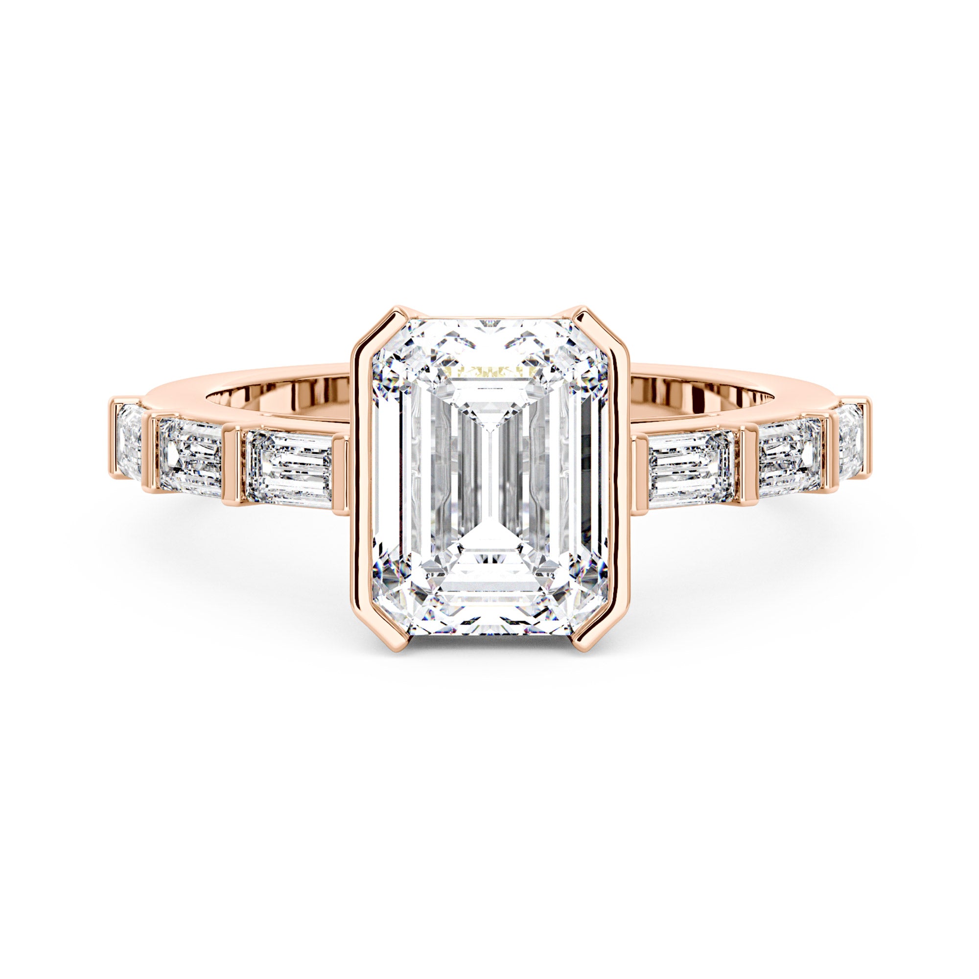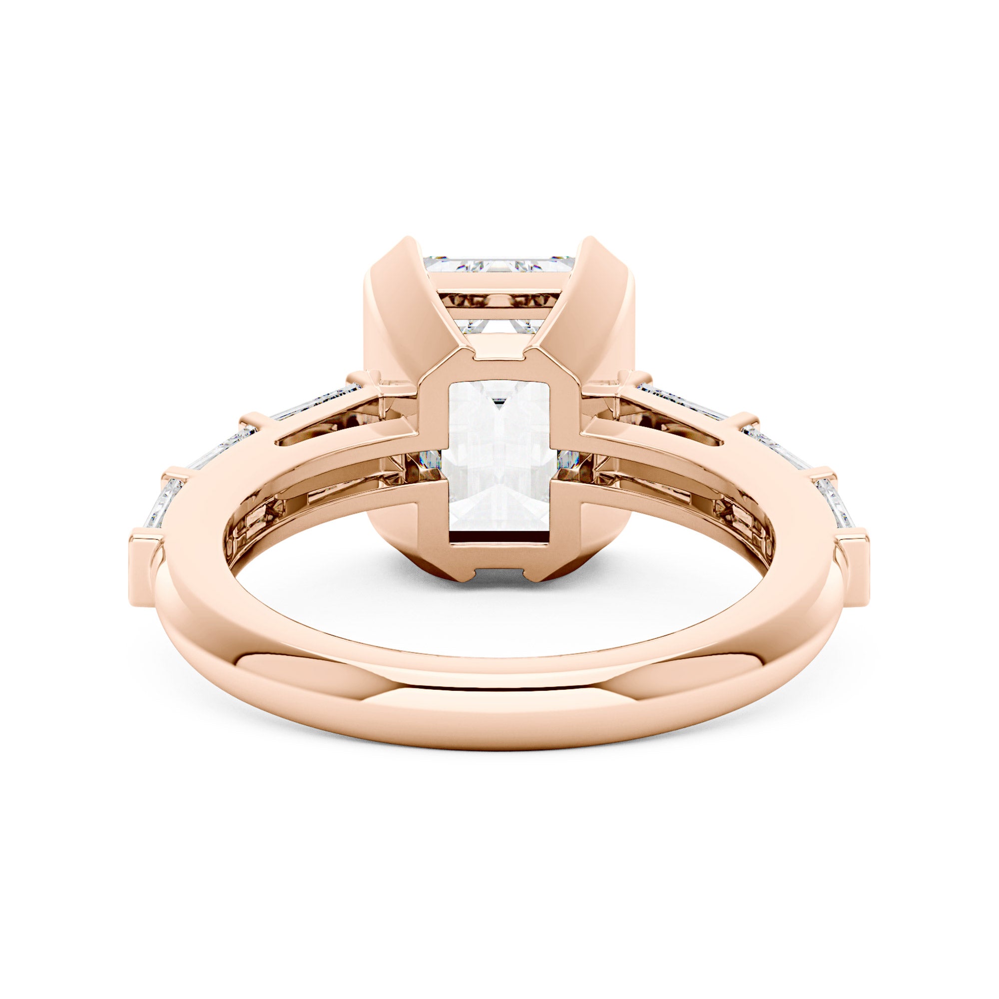 The design of this moissanite ring is unique, with a brilliant emerald-cut moissanite set in the center, surrounded by several small rectangular cut stones, beautifully bezel set for a sleek, contemporary look. It will become an indispensable accessory in your life, witnessing your every important moment.