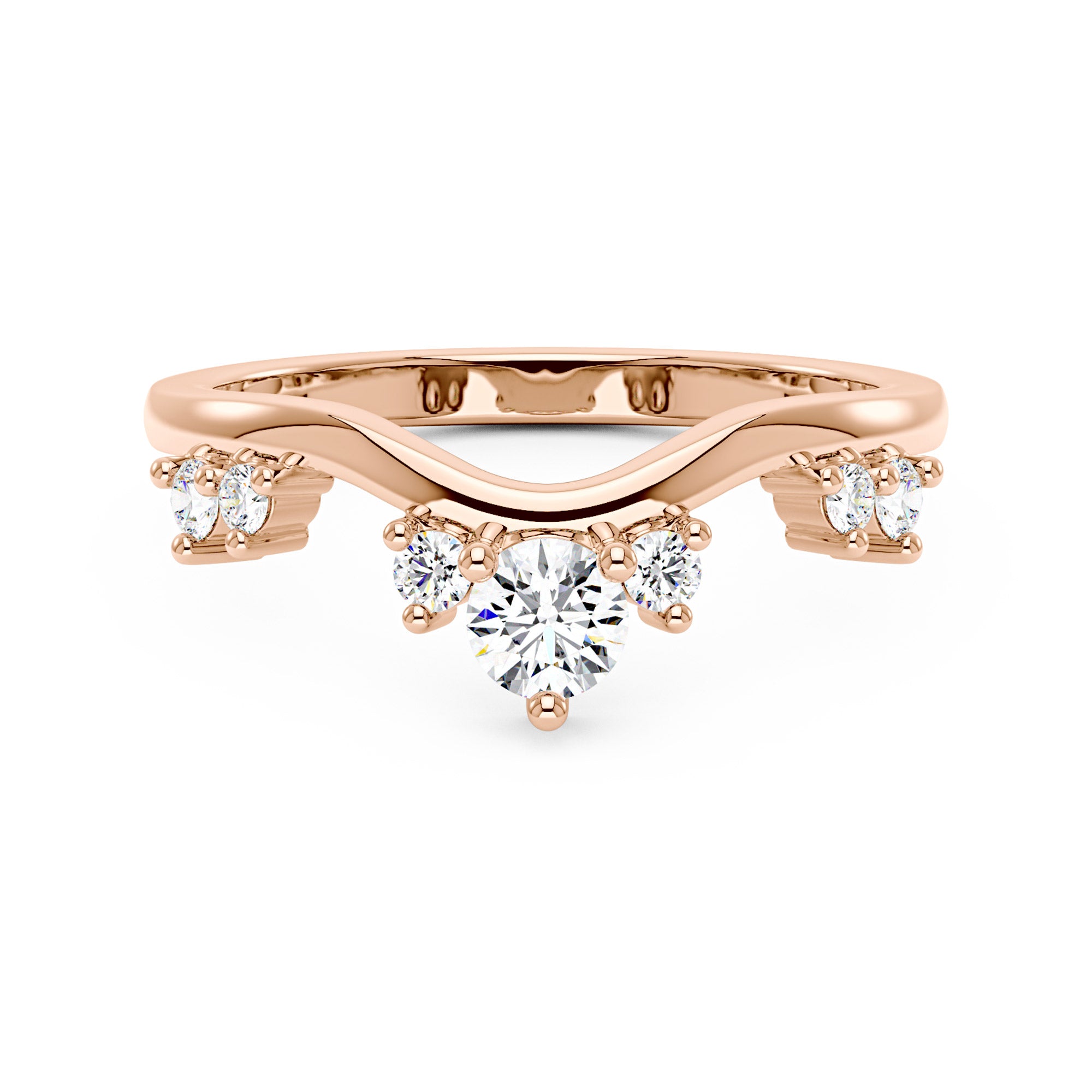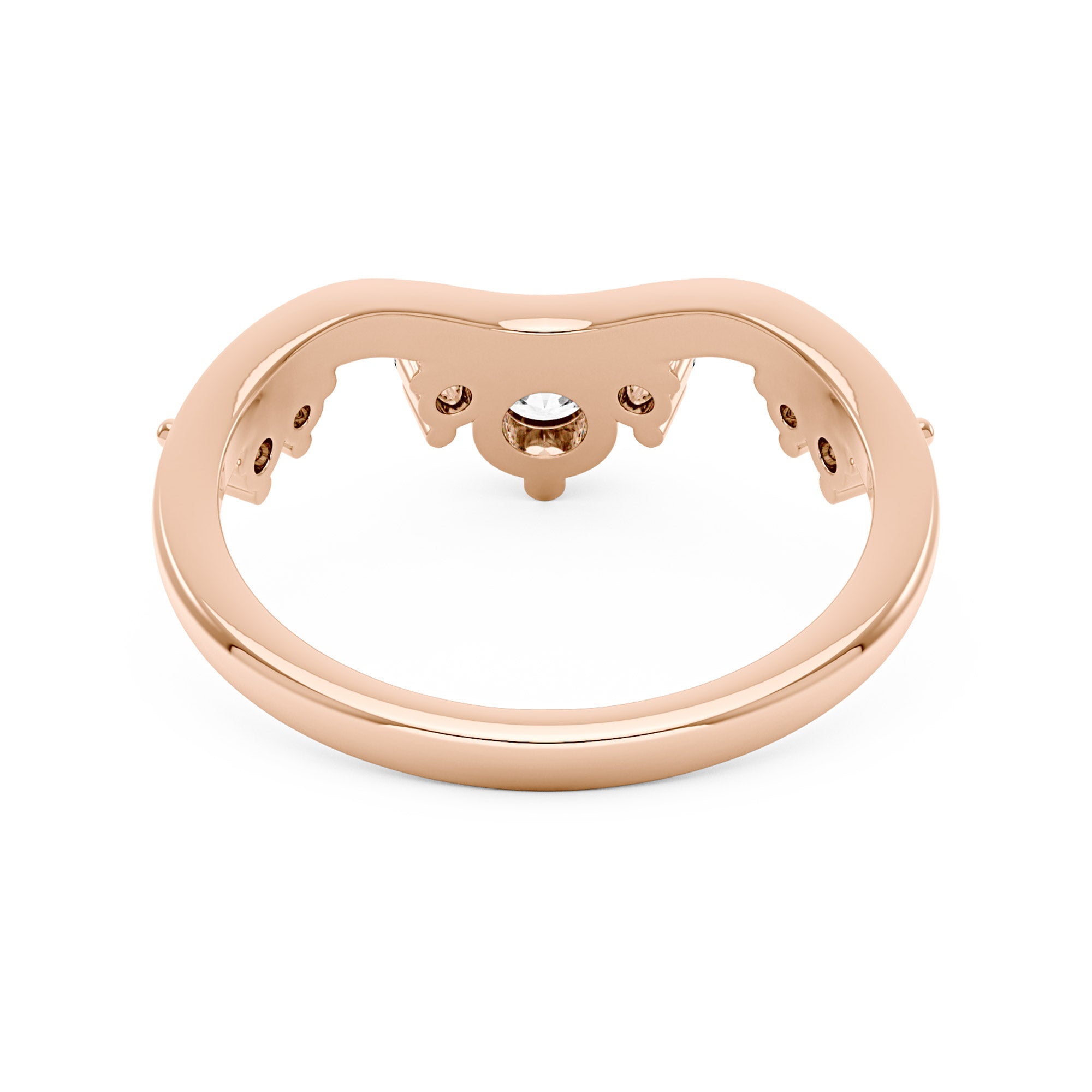 This exquisite ring design showcases a graceful curvature adorned with a symmetrical pattern of sparkling clear moissanites. Its intricate detailing embodies elegance and sophistication. Representing eternal love and commitment, it is ideal for the sophisticated and stylish woman who appreciates timeless beauty.