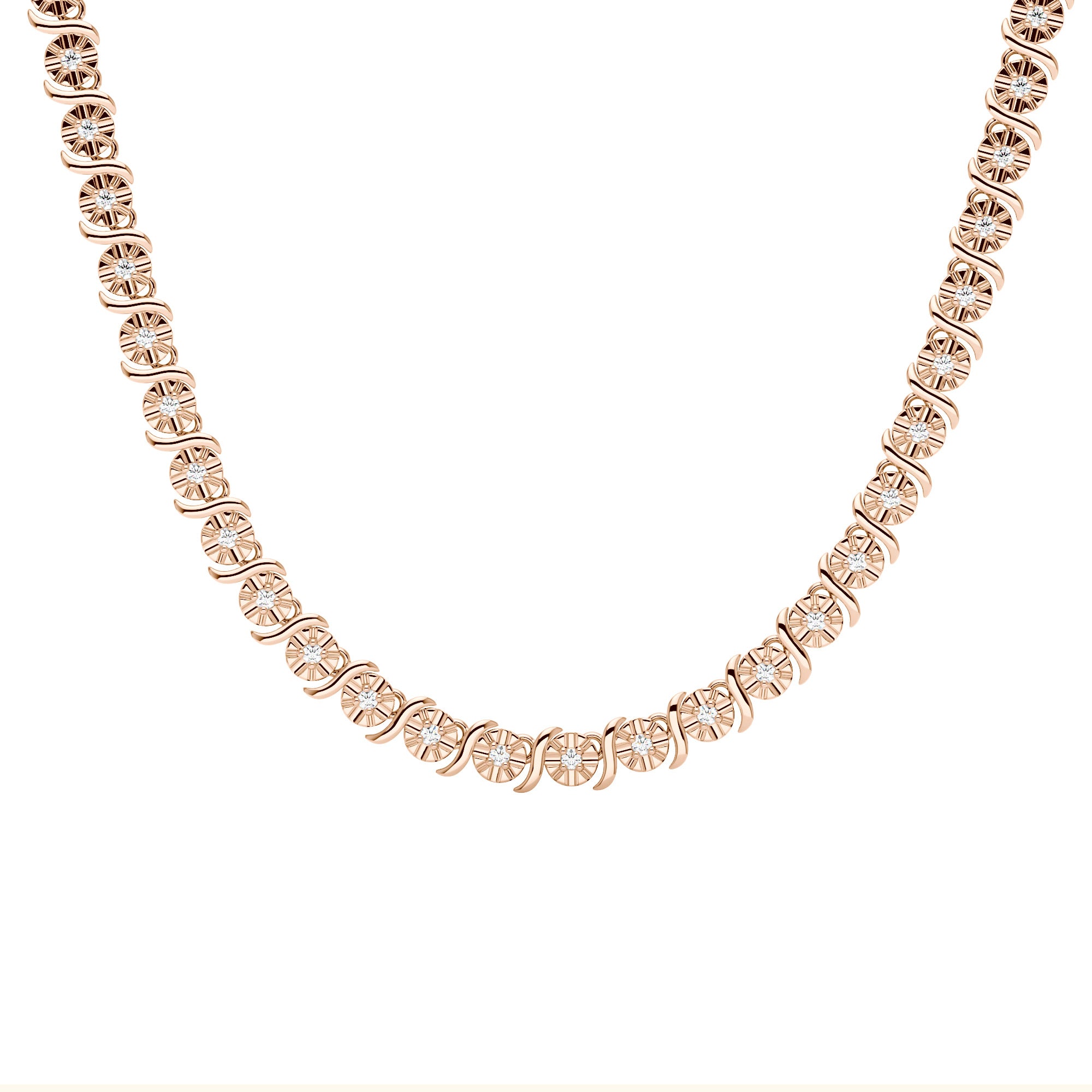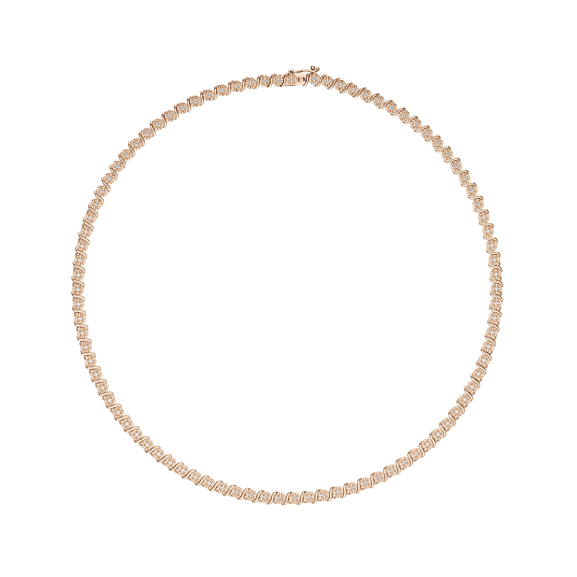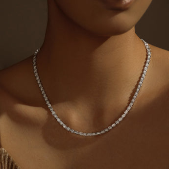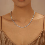 This moissanite necklace features a classic tennis chain design, consisting of a series of delicate small circular links tightly connected to form a smooth and flexible chain. The links are set with evenly sized moissanite stones all around, which are precisely aligned to create a dazzling sparkle under any light.