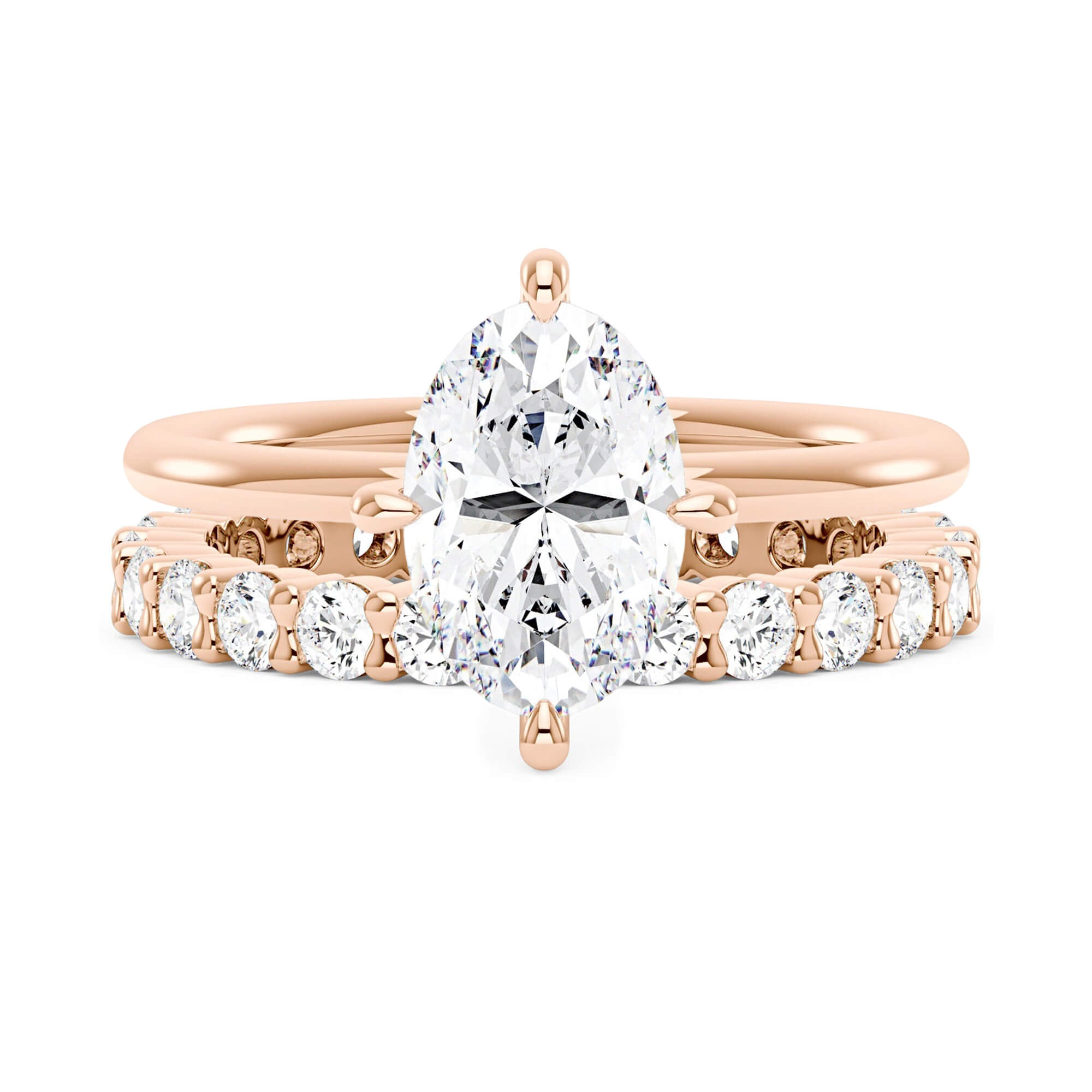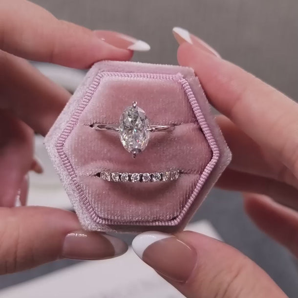 Elevate your bridal look with this stunning bridal set ring. Featuring an exquisite elongated oval cut moissanite solitaire ring, it exudes elegance and brilliance. Adorned with small moissanites set, the pavé eternity wedding band perfectly complements the solitaire, creating a harmonious and captivating design. Make a statement on your special day with this enchanting bridal ring set.