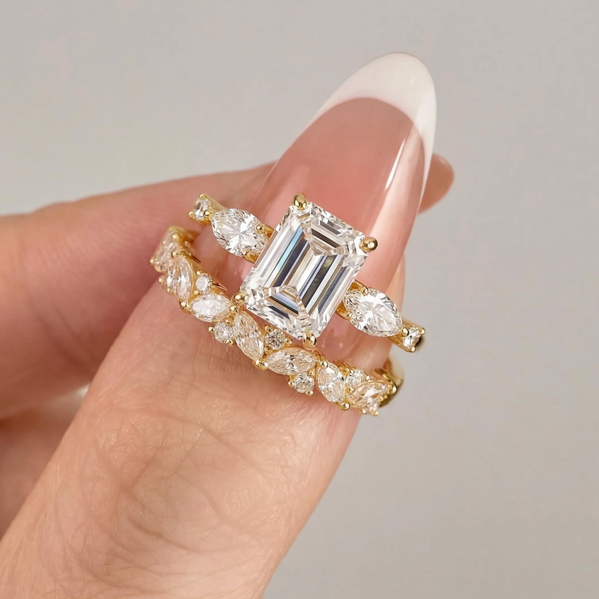 This three-stone ring showcases a striking emerald-cut moissanite center stone, flanked by two marquise-shaped side stones. Set in a sleek silver or gold band, and a wedding band with small moissanites stones all over to create a radiant and dazzling effect. This design combines classic and contemporary elements for a timeless appeal.