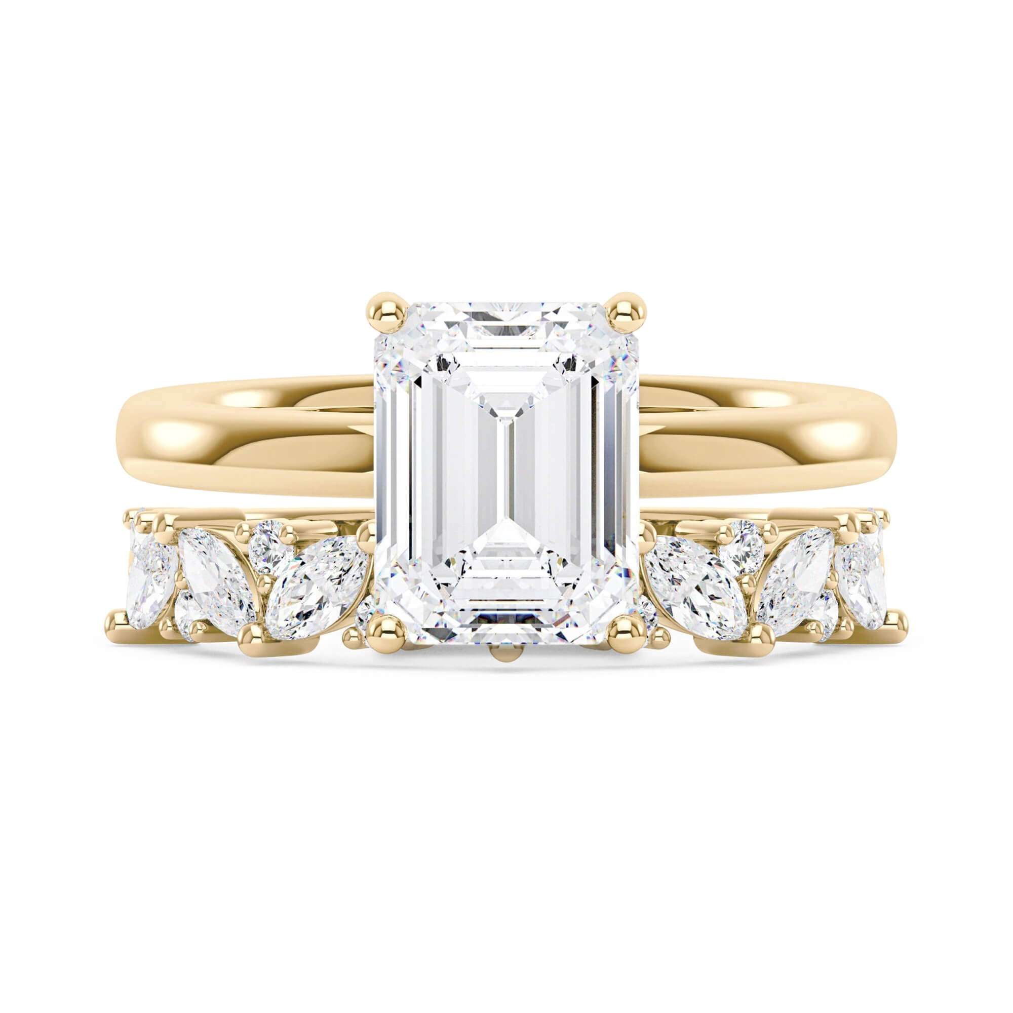 This solitaire ring is crafted in gold or silver with a classic four-prong setting, allowing the emerald cut moissanite to take center stage, and a wedding band with small moissanites stones all over to create a radiant and dazzling effect. Whether for wedding occasions or everyday wear, it will serve as a timeless symbol, capturing beautiful memories and precious moments.