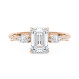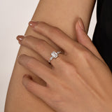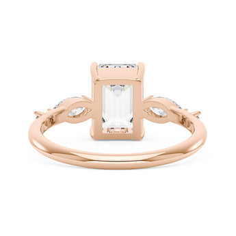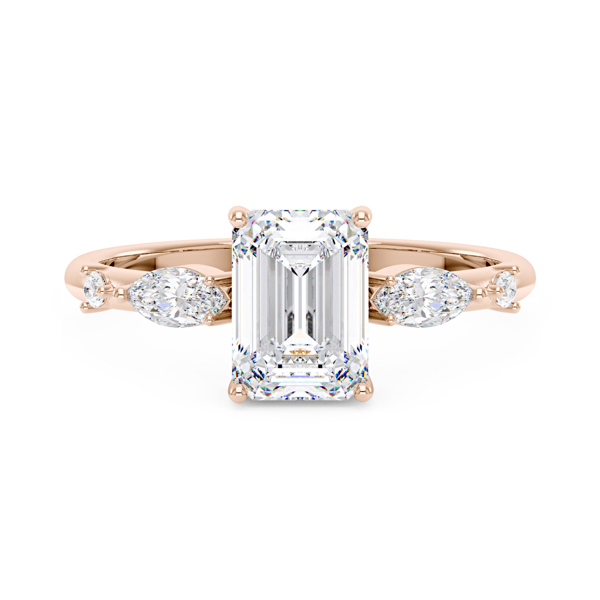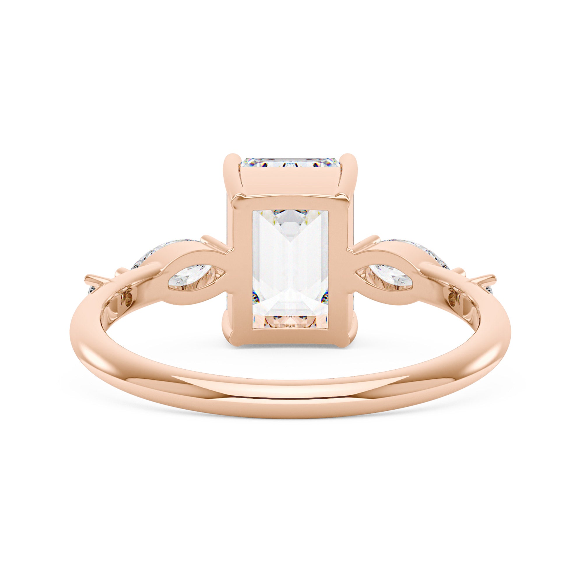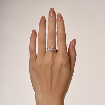 This three-stone ring showcases a striking emerald-cut moissanite center stone, flanked by two marquise-shaped side stones. Set in a sleek silver or gold band, this design combines classic and contemporary elements for a timeless appeal.