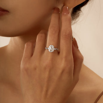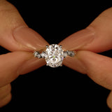 This is a exquisite ring, featuring an oval cut moissanite as its centerpiece. Surrounding the central stone are smaller accent stones that have been carefully placed to create a harmonious balance between elegance and simplicity. The craftsmanship suggests a high quality piece likely intended for special occasions such as engagements or anniversaries.