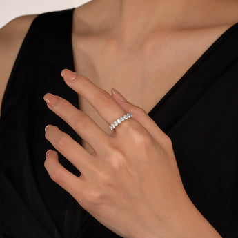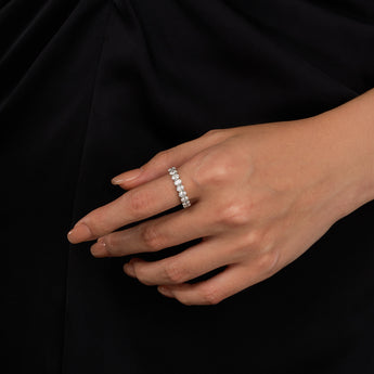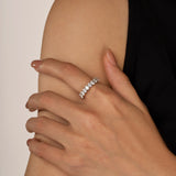 This stunning half eternity ring features nine 0.2 ct oval moissanite stones set in a sleek silver band. Each stone sparkles brilliantly, symbolizing everlasting love and commitment. Perfect for any special occasion, this elegant moissanite ring adds a touch of timeless beauty and sophistication to any jewelry collection.