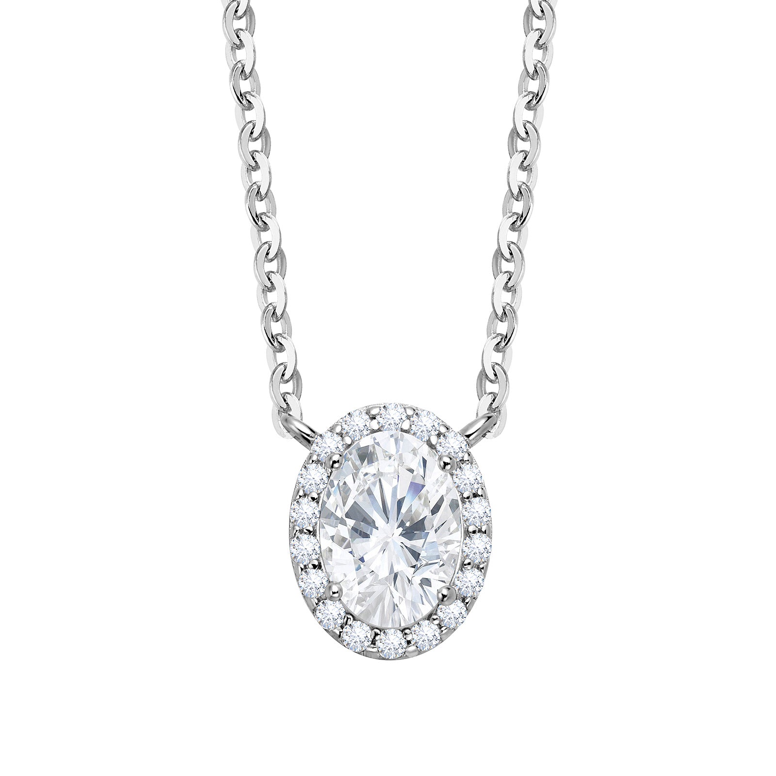 Celebrating the art of light, this pendant showcases a radiant oval-cut moissanite in a glorious halo setting. Designed to catch the light from every angle, the entire piece is suspended from a refined chain, creating a masterpiece of light and brilliance for effortless, everyday elegance.