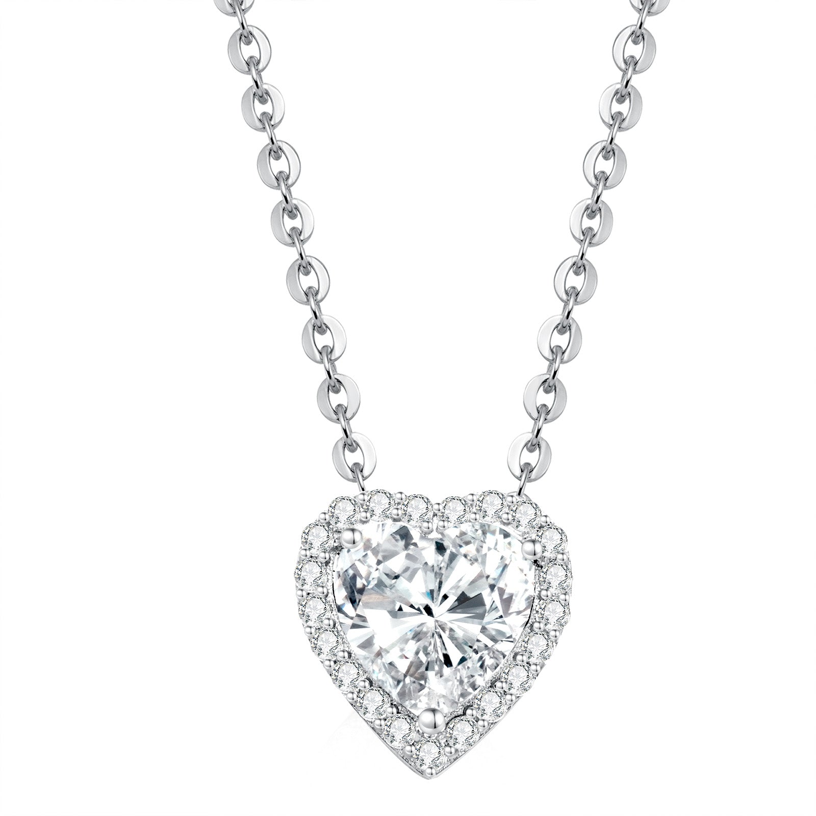 A timeless symbol of love, this pendant necklace features a luminous heart-shaped moissanite center stone, encircled by a dazzling halo of pavé-set accents. Gracefully suspended from a refined chain, it captures the light and the heart, serving as a radiant expression of affection.