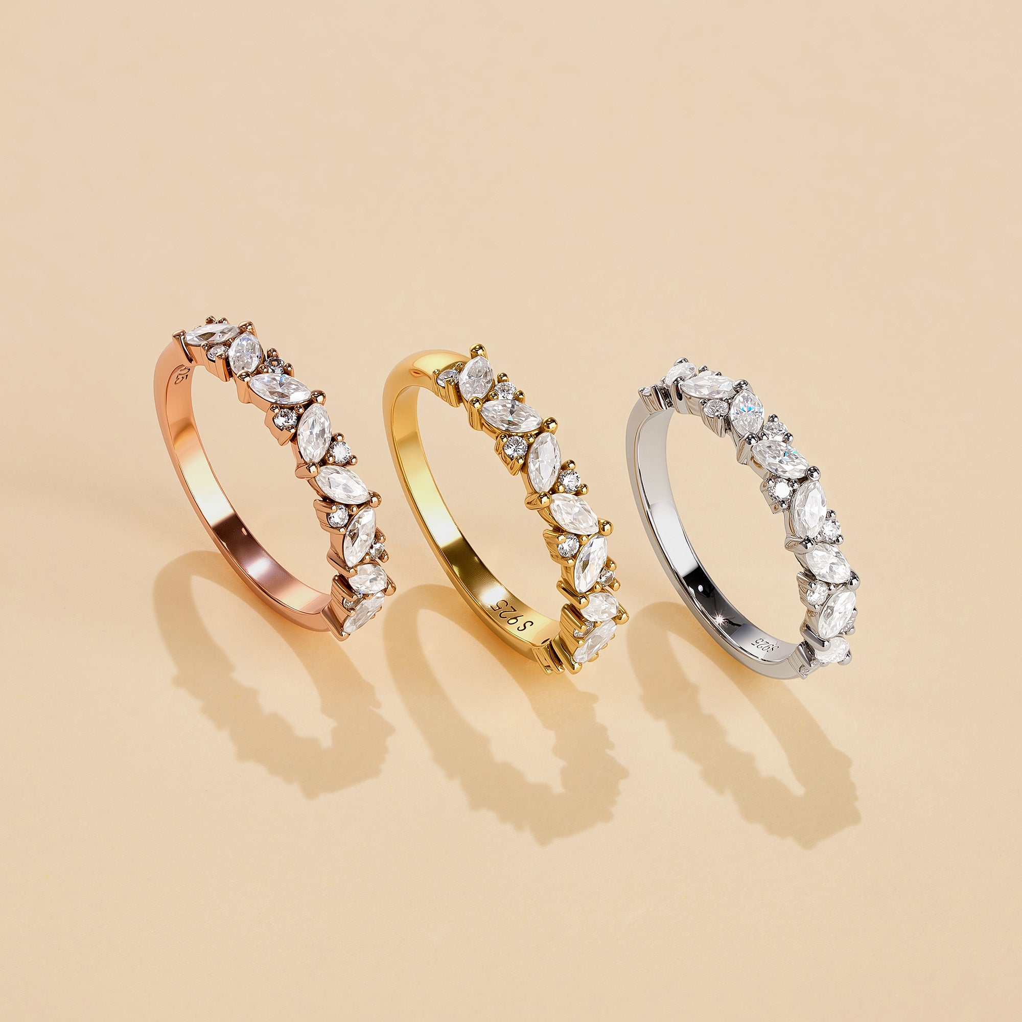 This half eternity ring is a harmonious blend of geometry and sparkle, with a sequence of marquise and round moissanite gems adorning its band. The ring’s silhouette is traced with the unique teardrop silhouette of marquise-cut stones, interspersed with the timeless gleam of round-cut gems. The moissanite stones, known for their exceptional fire and brilliance, catch the light with every movement, making the ring a shimmering statement of refined taste.
