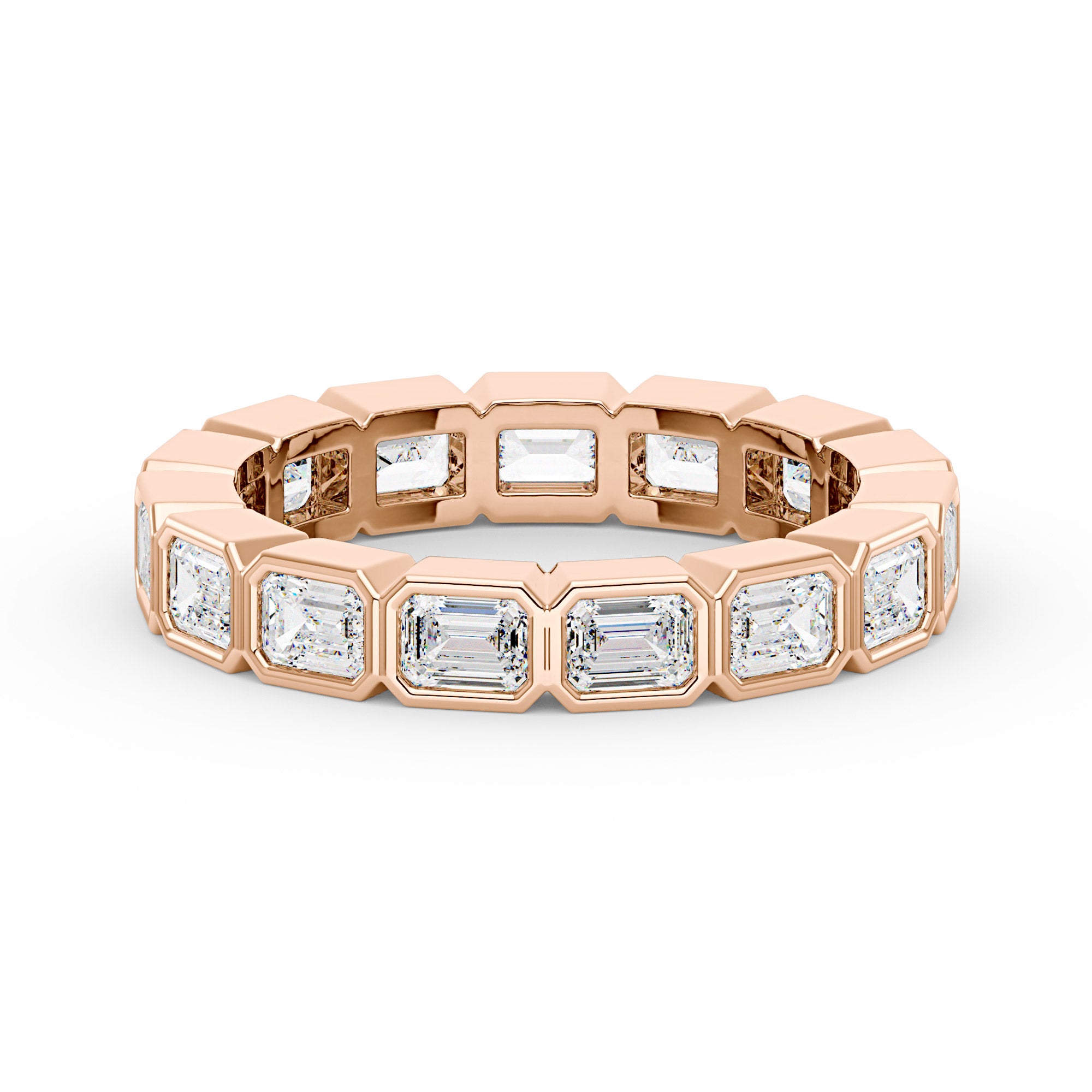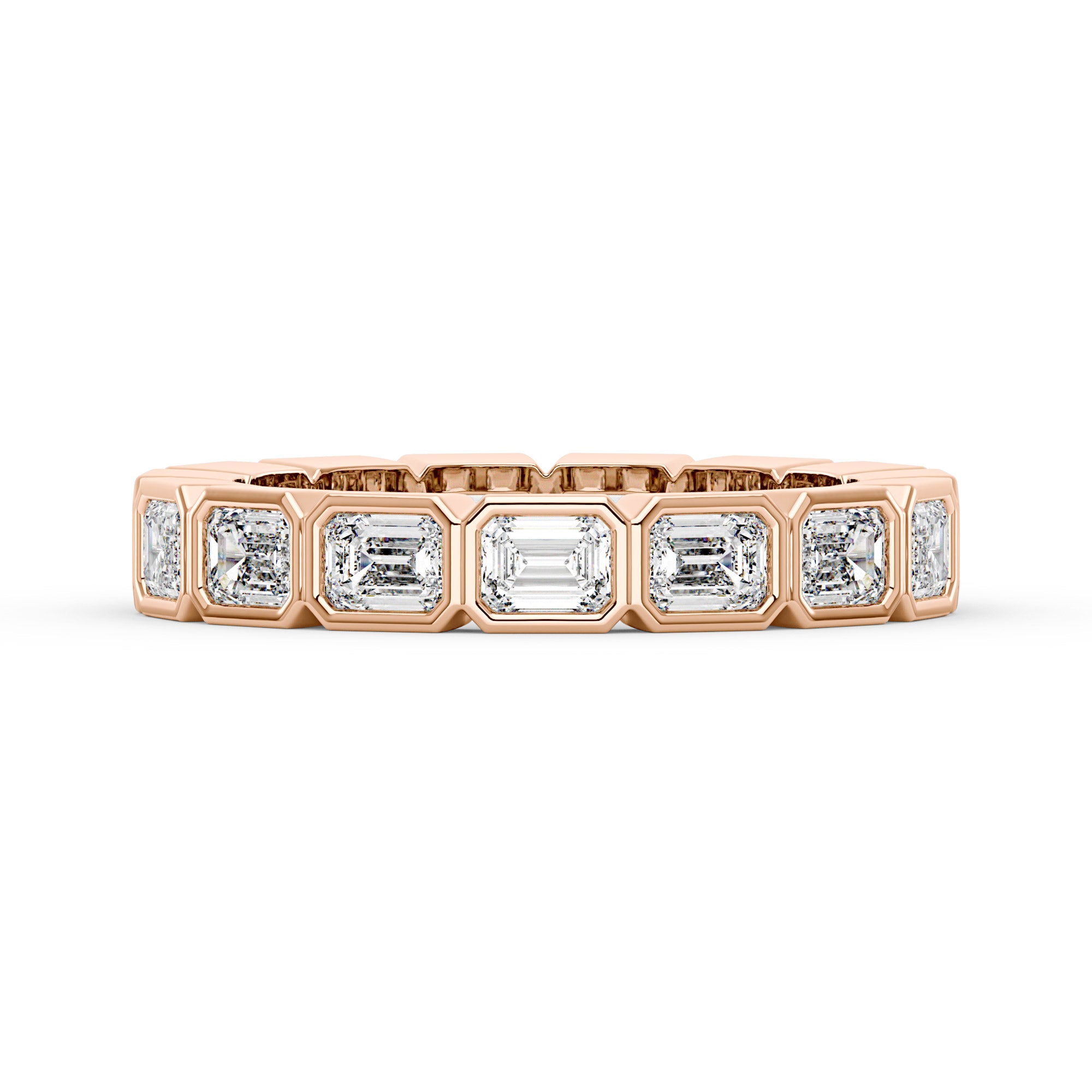This stunning bezel eternity band features 3 mm x 4 mm small emerald-cut moissanite stones all around. The sleek bezel setting enhances the stones' sparkle, creating a timeless and elegant piece that symbolizes everlasting love and commitment, perfect for any special occasion.