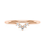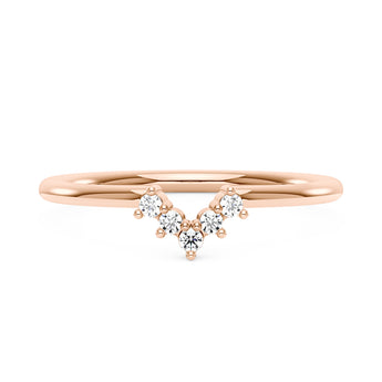 This is a gold ring with five moissanites set on it, forming a beautiful curve shape. The moissanites are sparkling and radiate brilliance against the gold background. It is a exquisite piece of jewelry that combines modern design with classic elements.