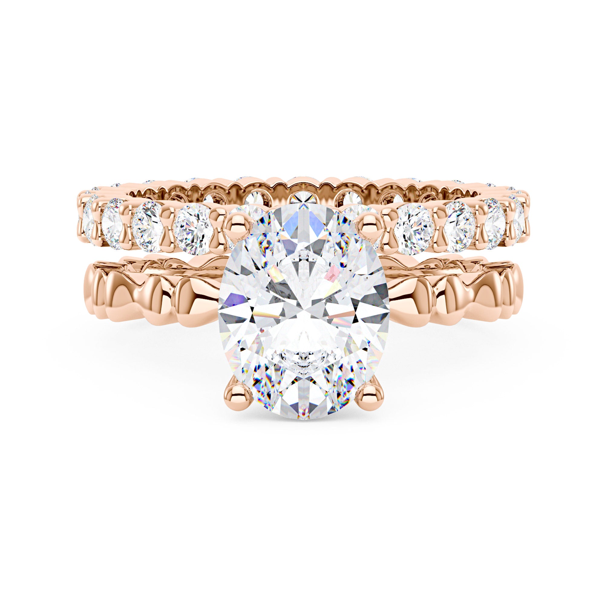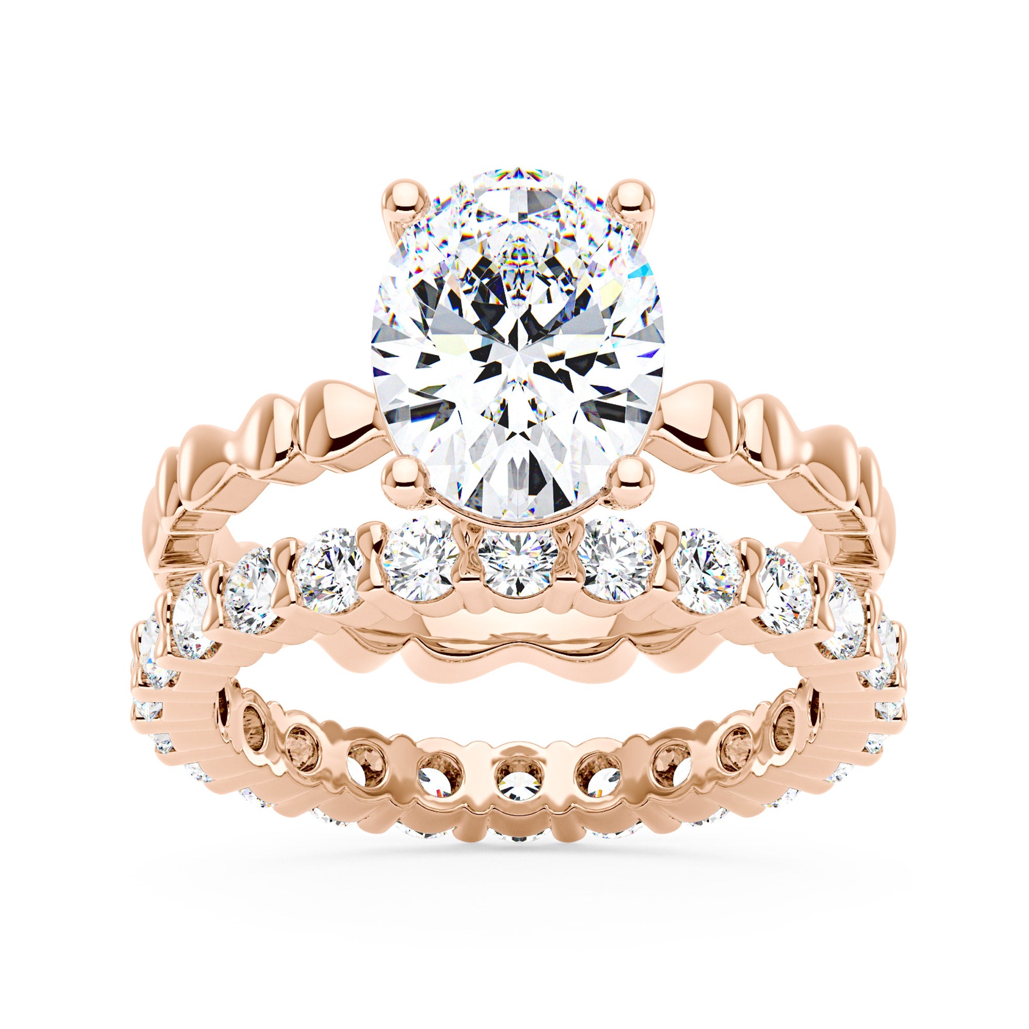 This moissanite ring set sparkles with eternal brilliance, featuring unique bow tie design on the band that adds a touch of romance. The solitaire engagement ring is crafted with an exquisite oval-shaped moissanite stone at its center, while the eternity wedding band is adorned with small round moissanites all around.