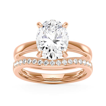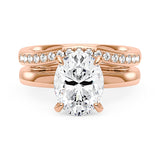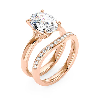 Elevate your bridal look with this stunning bridal set ring. Featuring an exquisite oval cut moissanite solitaire ring, it exudes elegance and brilliance. Adorned with small moissanites set, the curved wedding band perfectly complements the solitaire, creating a harmonious and captivating design. Make a statement on your special day with this enchanting bridal ring set.