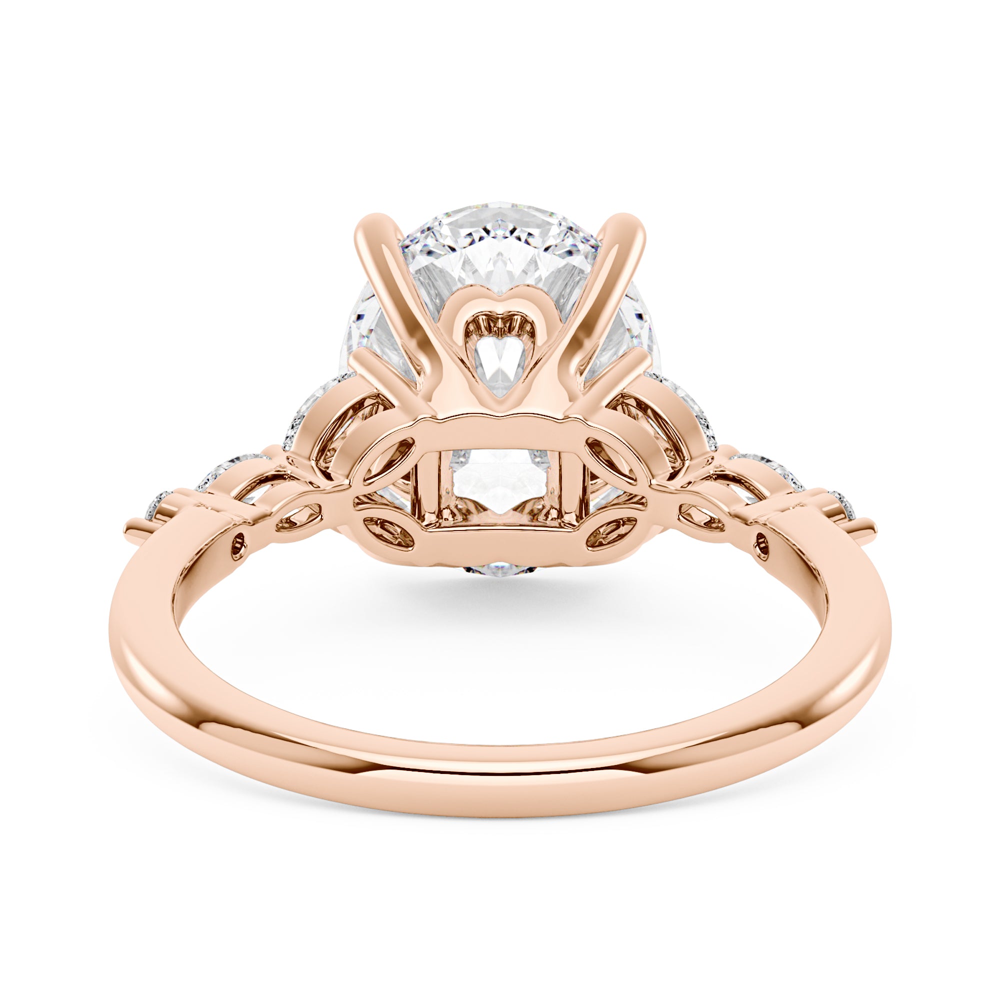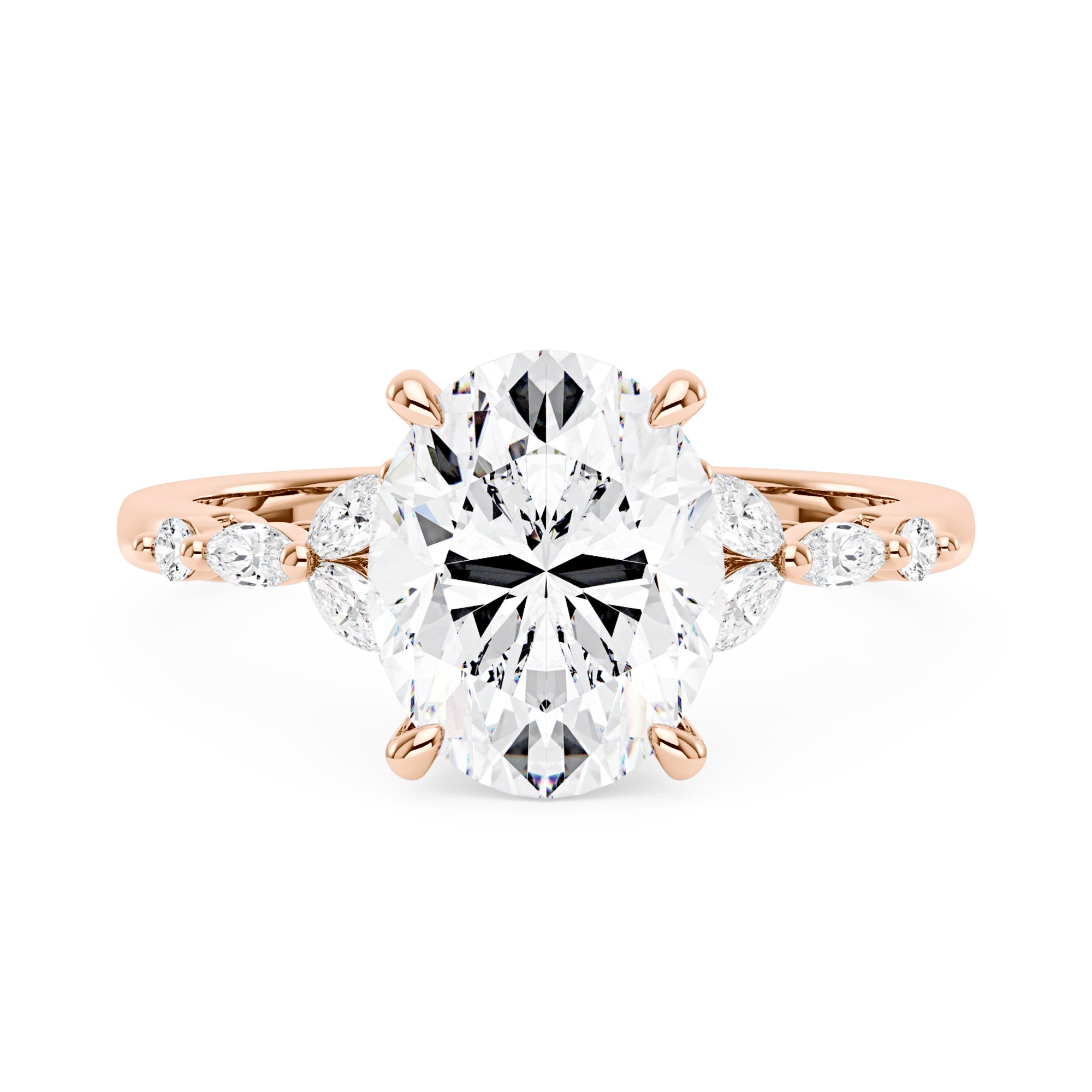This exquisite engagement ring features a radiant oval cut moissanite center stone, flanked by four marquise-shaped moissanites. The sleek band is lined with delicate moissanite stones adding sparkle to every gesture. Perfect for engagements or as a testament to enduring style.