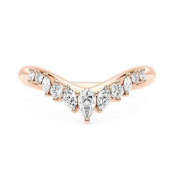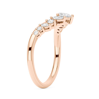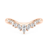 This is a gold ring with a total of nine diamonds, including a large pear-shaped diamond at the center and eight small round diamonds on both sides. The design is unique and exquisite, suitable for special occasions such as weddings or anniversaries.
