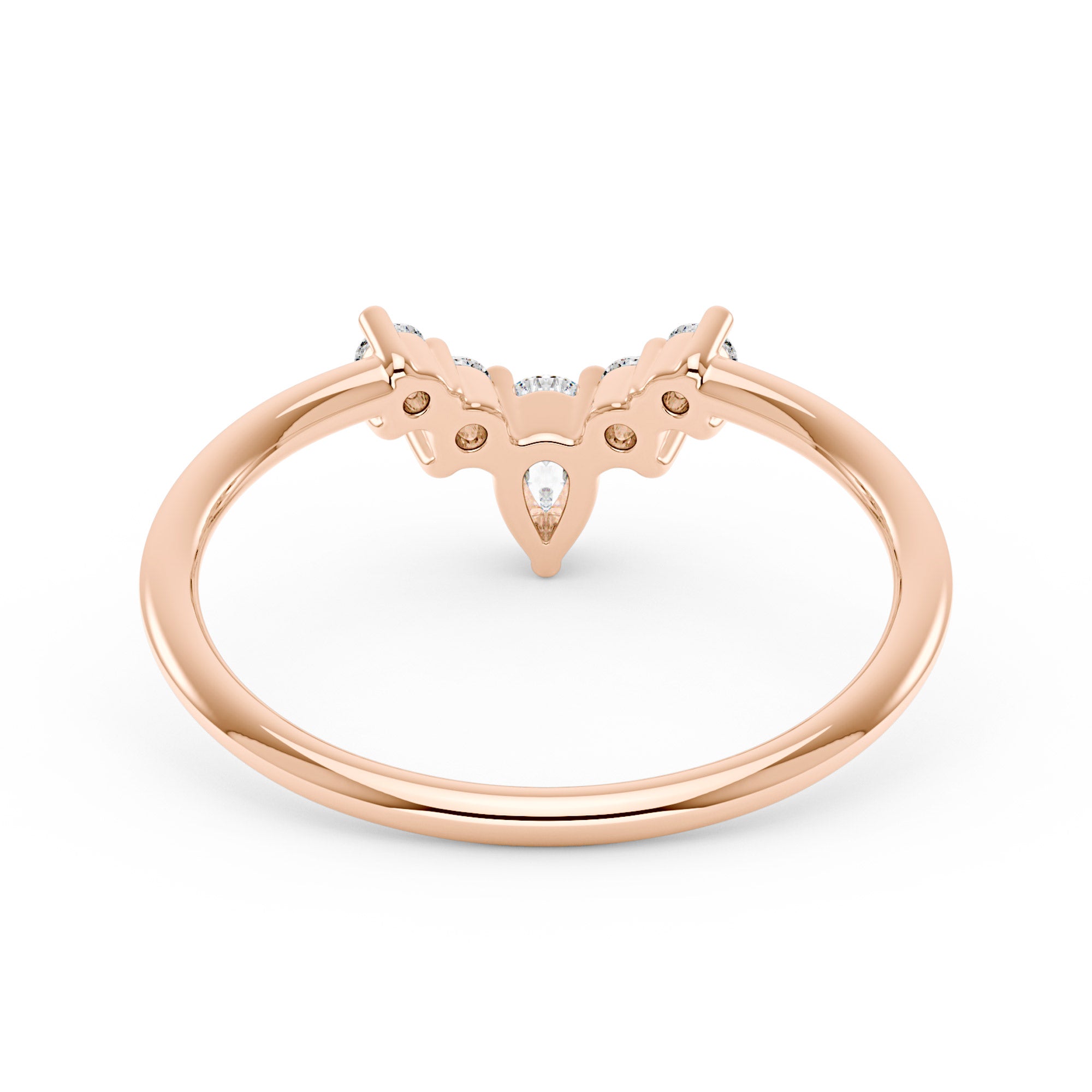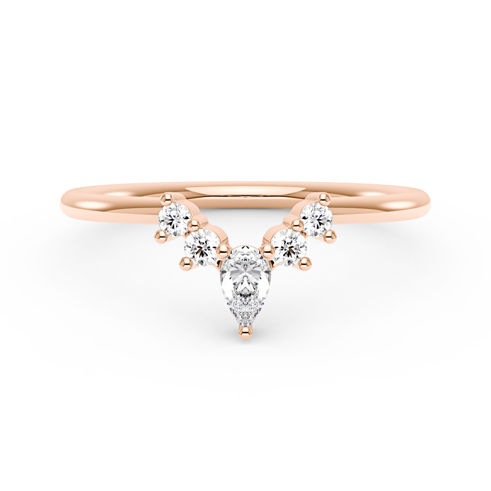 With a 3 mm x 5 mm pear-cut moissanite and four round accents on a slender band, this graceful design curves elegantly around your engagement ring. Perfect for your wedding day or commemorating years of love, this curved band ring is a timeless symbol of your most cherished moments.