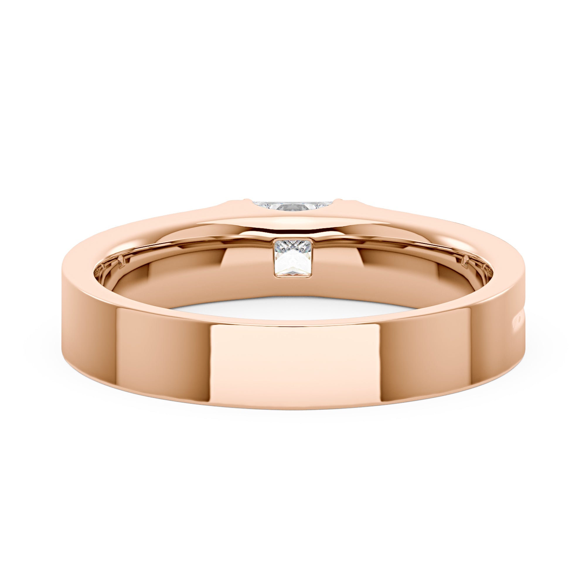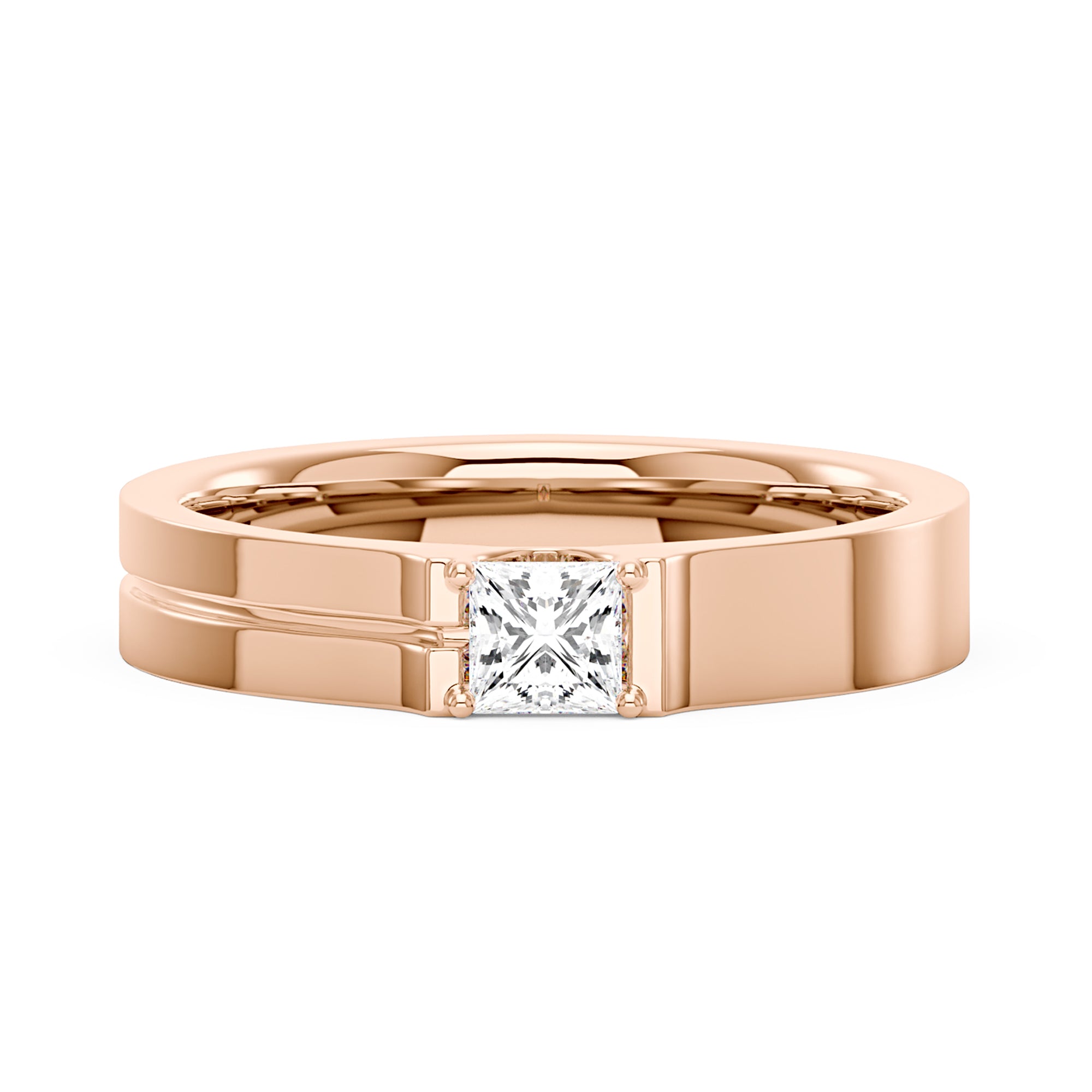 This exquisite ring features a princess cut moissanite as its centerpiece, accentuated by a side stone that adds to its overall radiance. The band’s polished finish complements the clarity and brilliance of the moissanite, making it a symbol of enduring elegance and love.