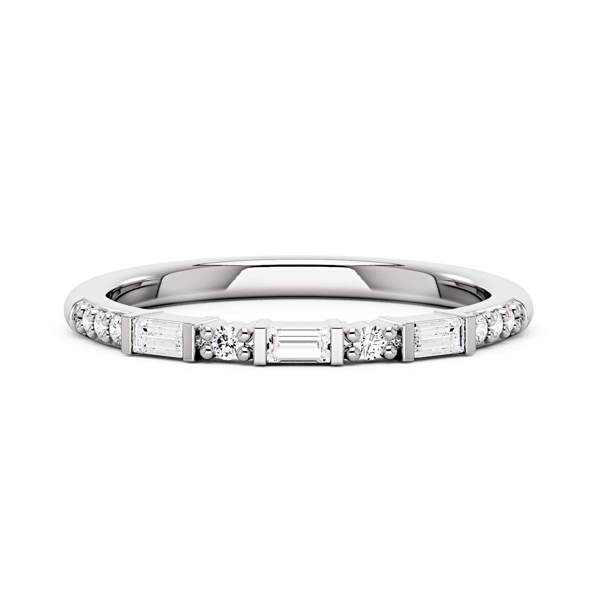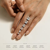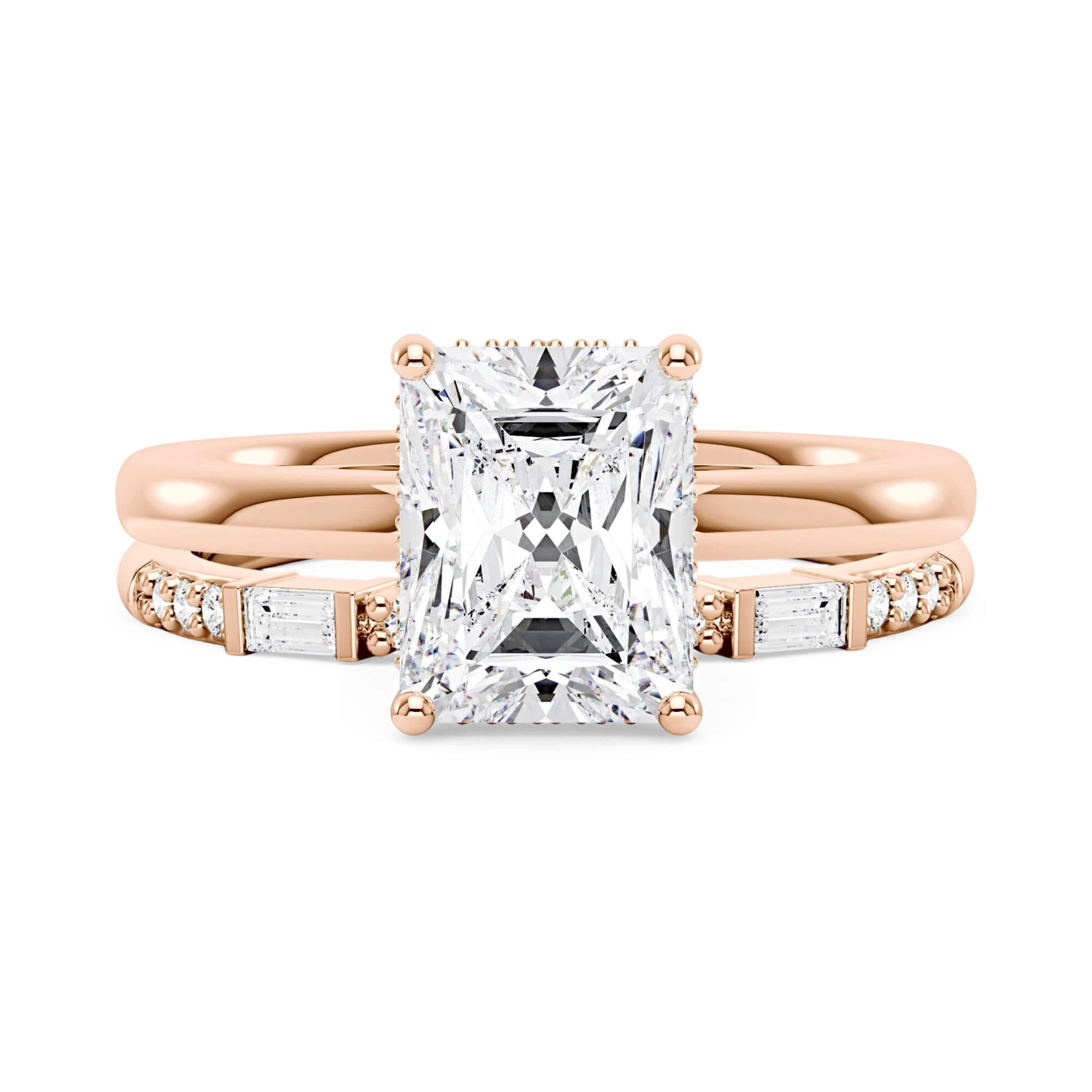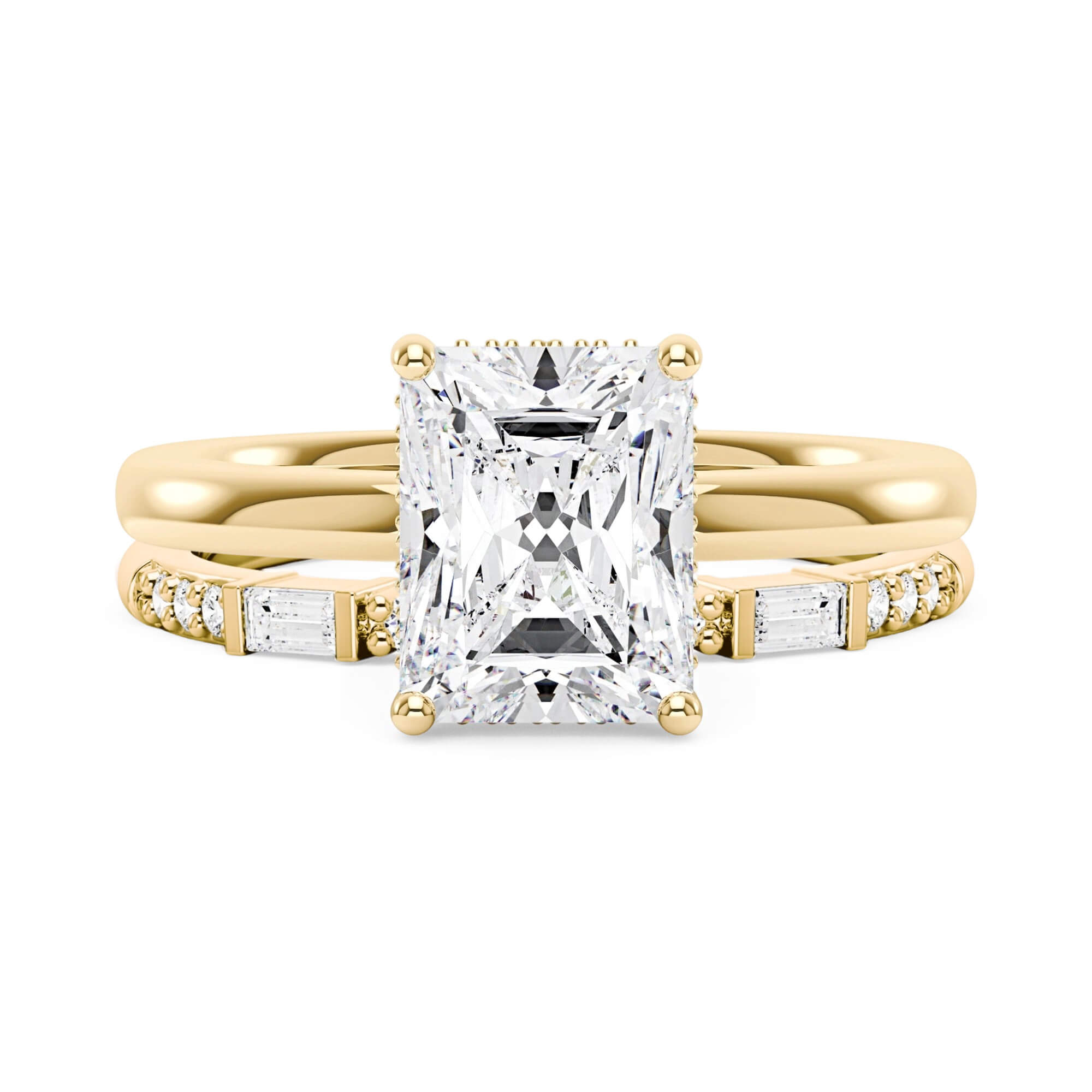 This solitaire ring is crafted in gold or silver with a classic four-prong setting, allowing the emerald cut moissanite to take center stage, and a wedding band with small moissanites stones all over to create a radiant and dazzling effect. Whether for wedding occasions or everyday wear, it will serve as a timeless symbol, capturing beautiful memories and precious moments.