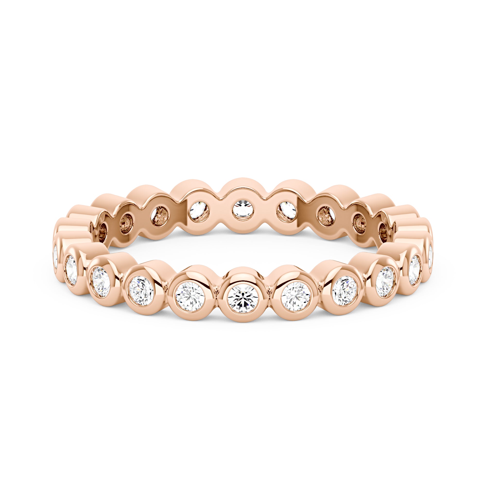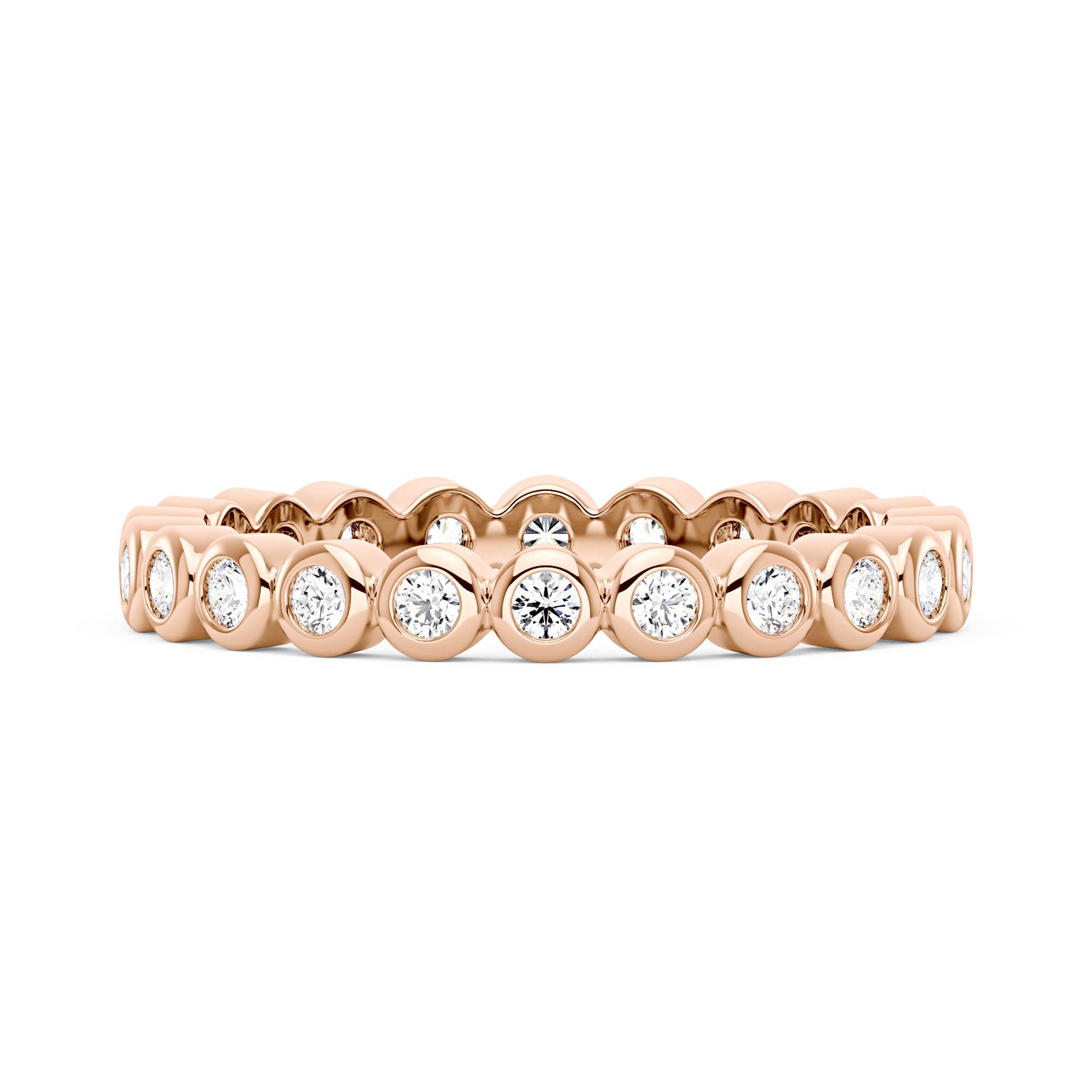 This exquisite eternity ring features a full circle of round cut moissanites set closely together to create an uninterrupted loop of sparkle. The shared prong setting not only securely holds each diamond but also allows light to cascade through their facets, bringing out the maximum possible shine.