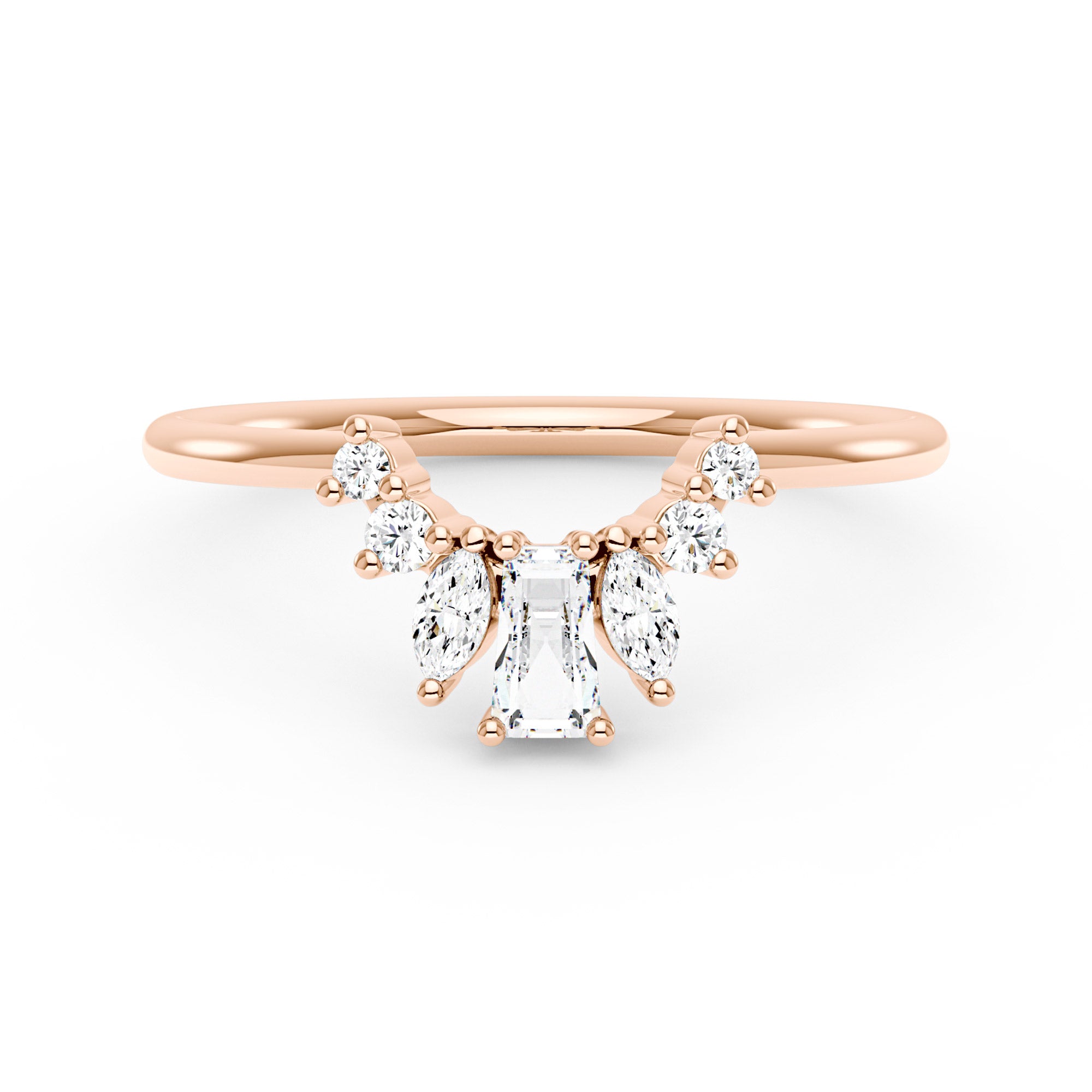 This moissanite wedding band features a stunning combination of tapered baguette, marquise, and round stones set on a curved band, creating a enchanting, high-jewelry aesthetic. The delicate prongs encircling each stone resemble glistening metal dewdrops, perfectly accentuating the band’s elaborate composition.